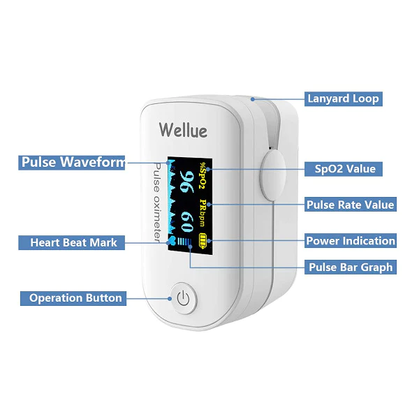 The finger pulse oximeter measures blood oxygen level and heart rate. Instructions are included.